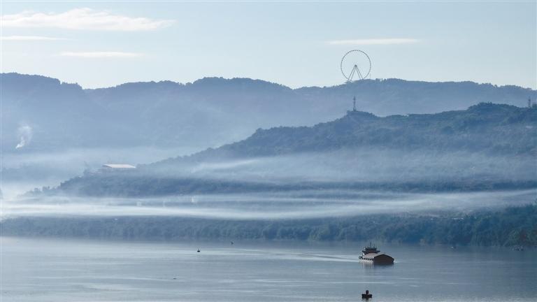 近日,清晨的涪陵美心红酒小镇长江江面段雾气氤氲,游船缓缓航行在碧波之上。当游船行至长江与梨香溪两江交汇附近的美心红酒小镇时,极目远望,重庆海拔最高的摩天轮“乡村振兴之眼”在山巅缓缓转动,此时此景,犹如一幅立体山水画。